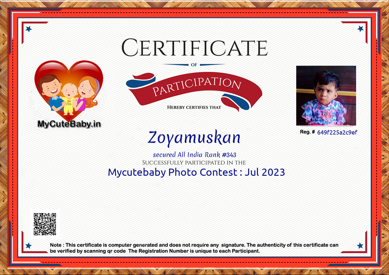 Participation certificate for all the participants whose mycutebaby votes are more than 1000.
