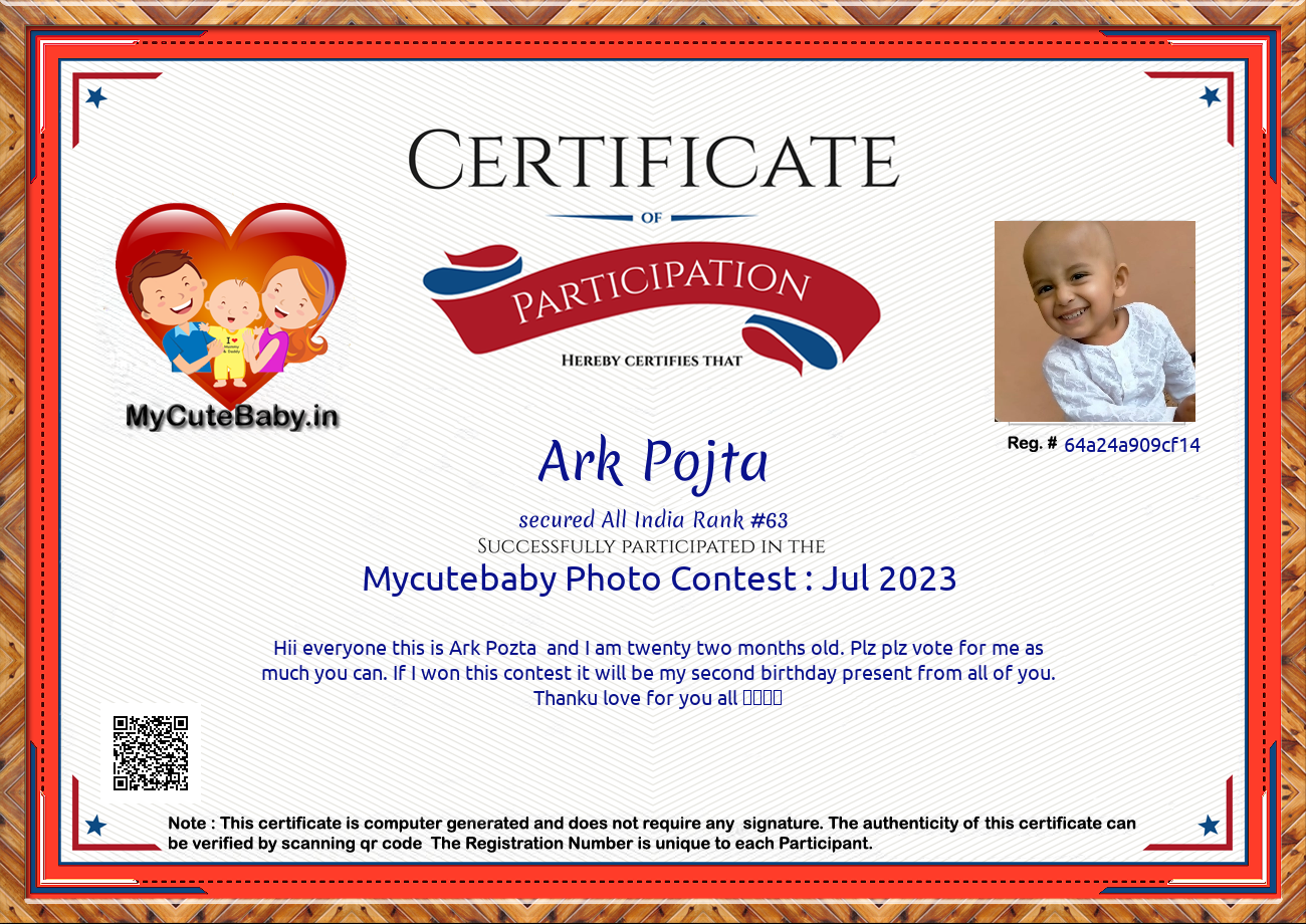 Participation certificate for all the participants whose mycutebaby votes are more than 1000.