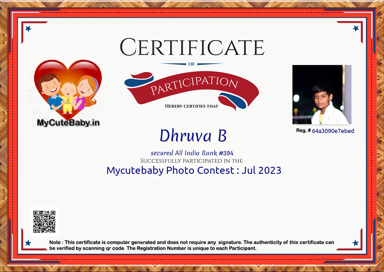 Participation certificate for all the participants whose mycutebaby votes are more than 1000.