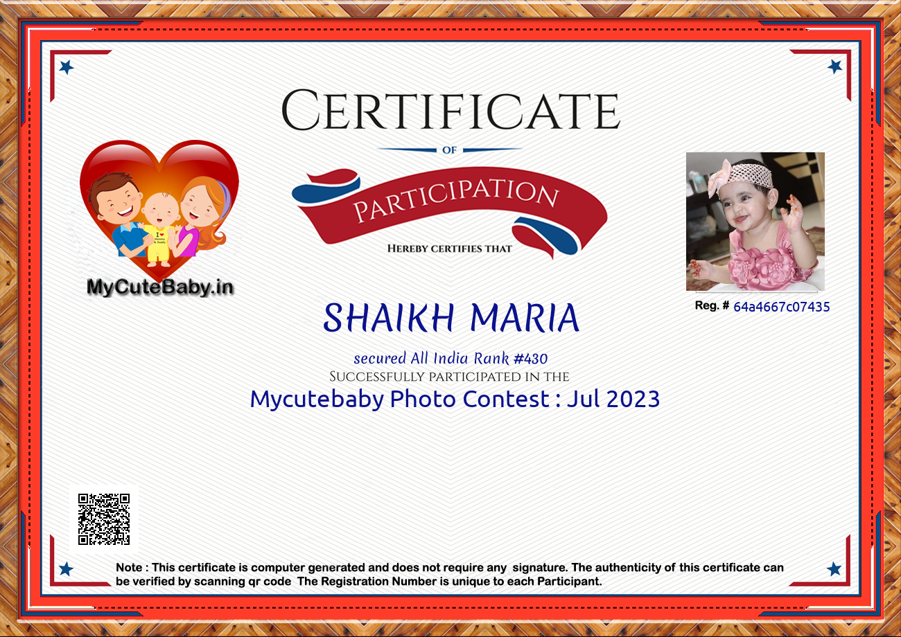 Participation certificate for all the participants whose mycutebaby votes are more than 1000.