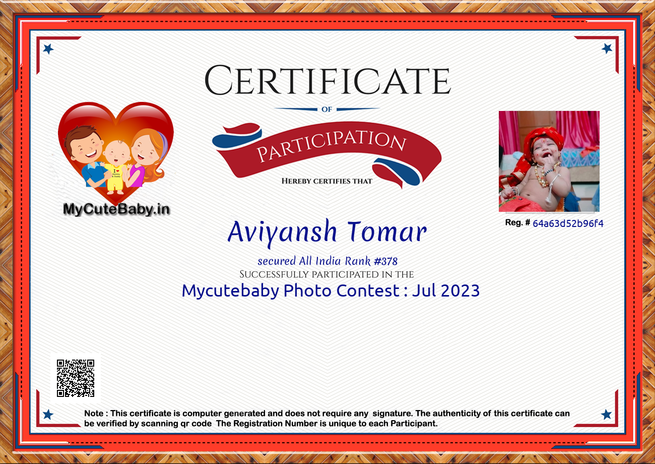 Participation certificate for all the participants whose mycutebaby votes are more than 1000.
