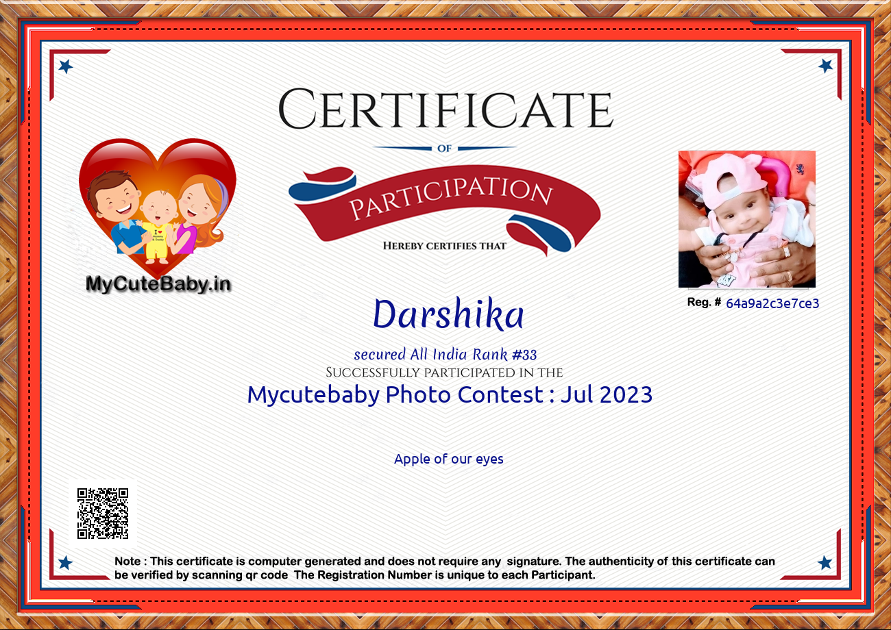 Participation certificate for all the participants whose mycutebaby votes are more than 1000.
