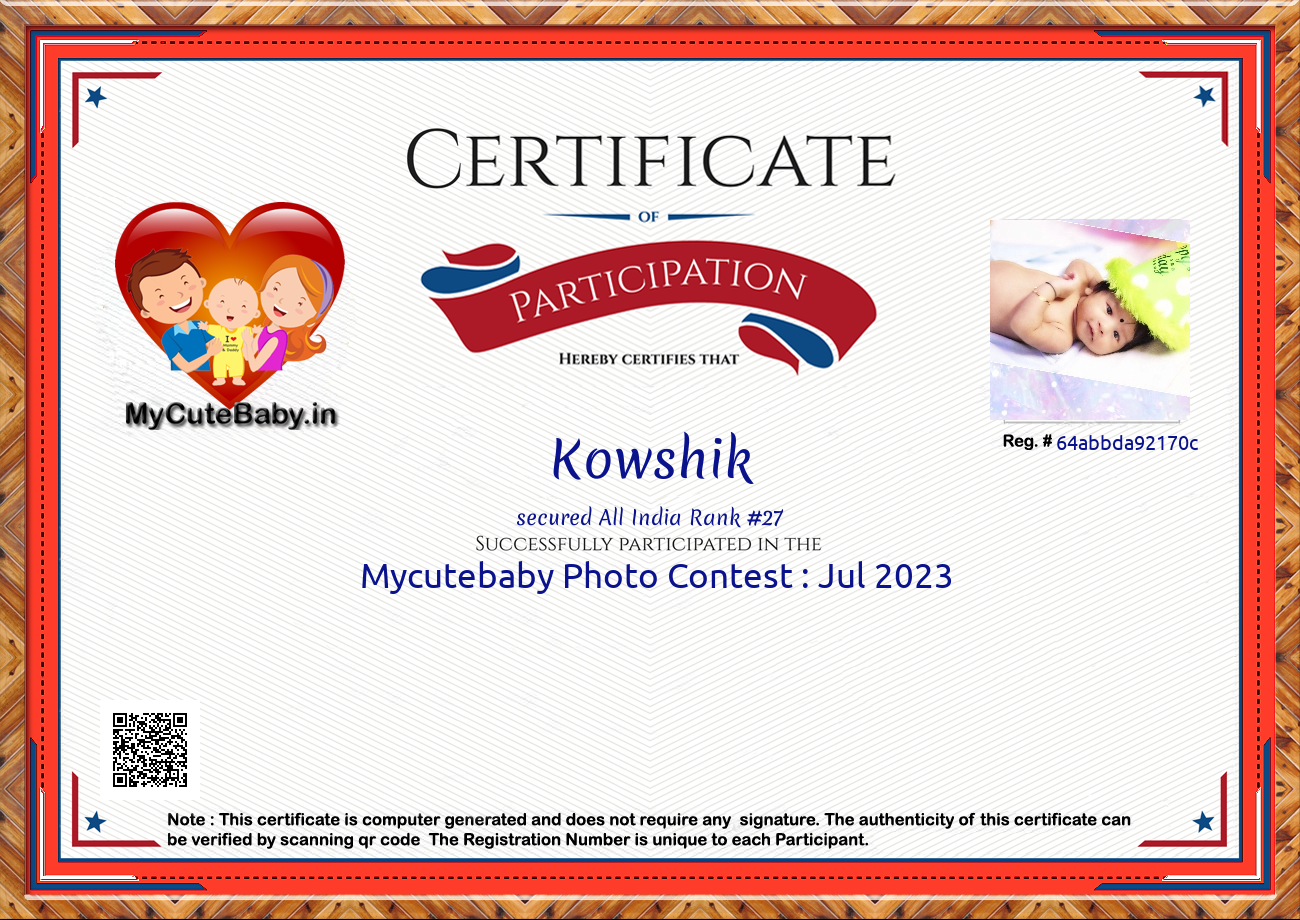 Participation certificate for all the participants whose mycutebaby votes are more than 1000.