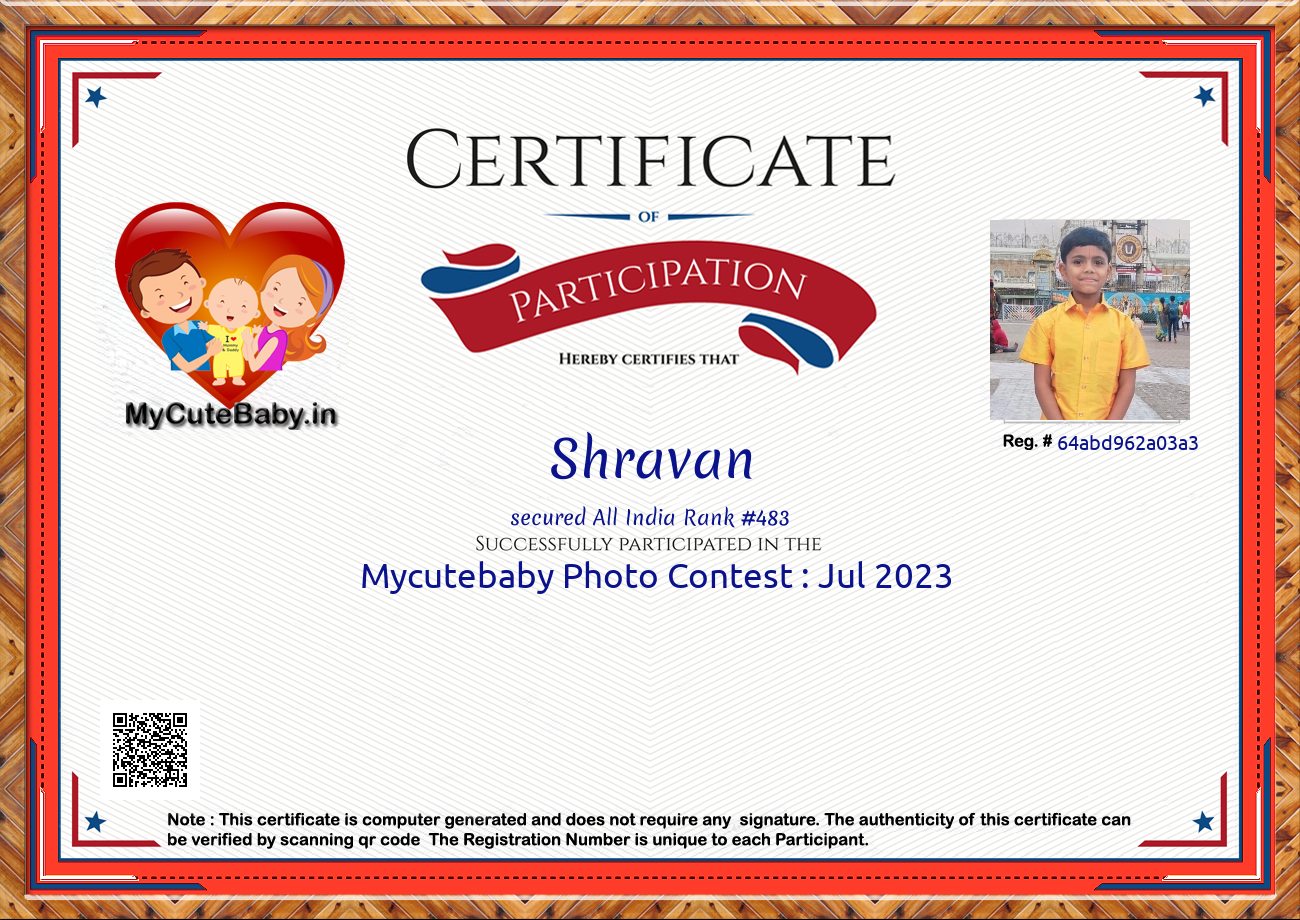 Participation certificate for all the participants whose mycutebaby votes are more than 1000.