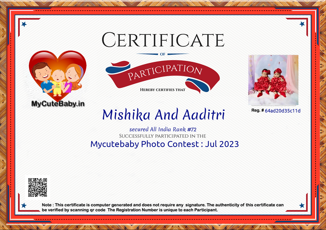 Participation certificate for all the participants whose mycutebaby votes are more than 1000.