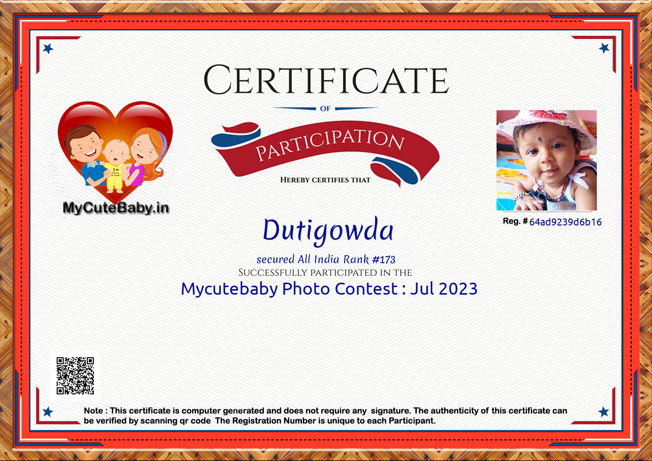 Participation certificate for all the participants whose mycutebaby votes are more than 1000.