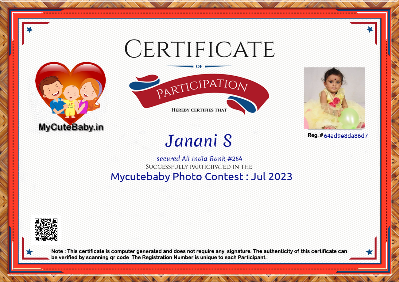 Participation certificate for all the participants whose mycutebaby votes are more than 1000.