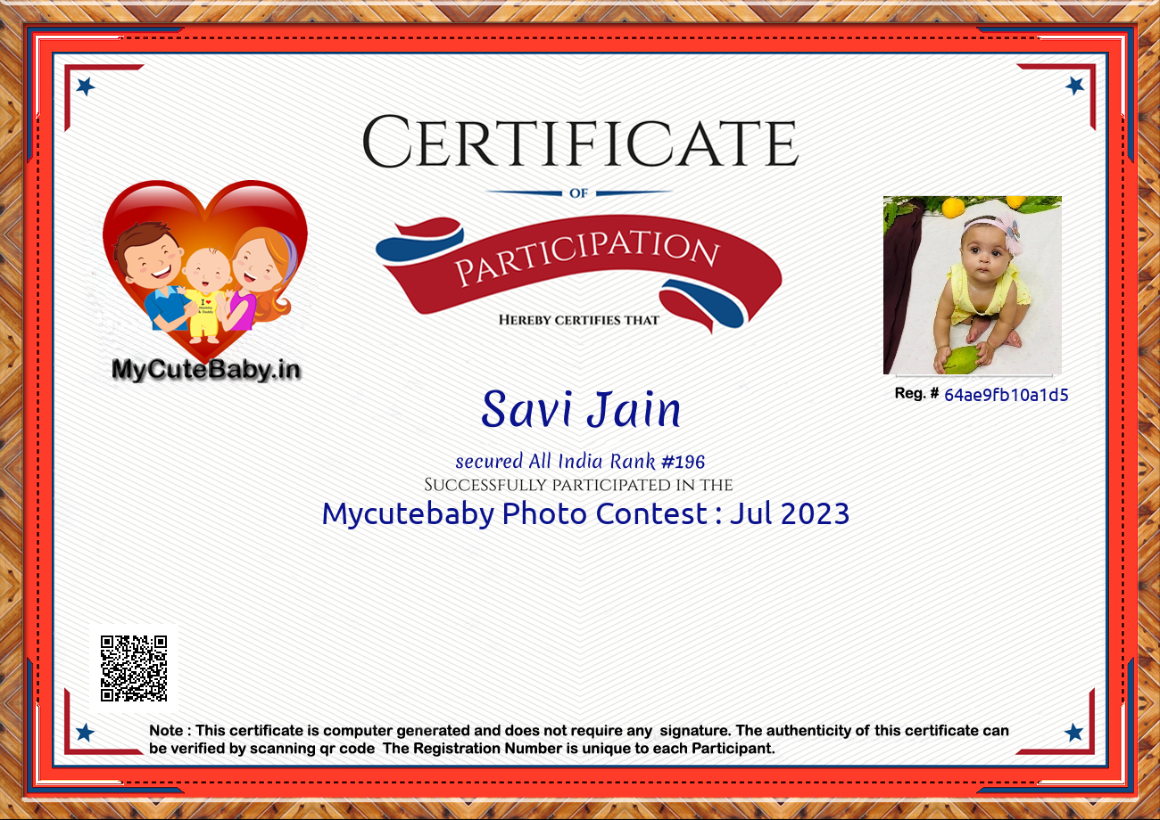 Participation certificate for all the participants whose mycutebaby votes are more than 1000.