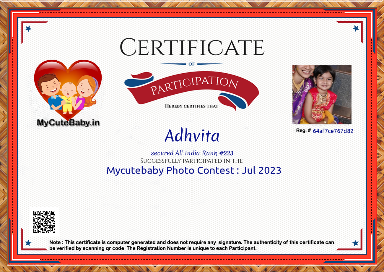 Participation certificate for all the participants whose mycutebaby votes are more than 1000.