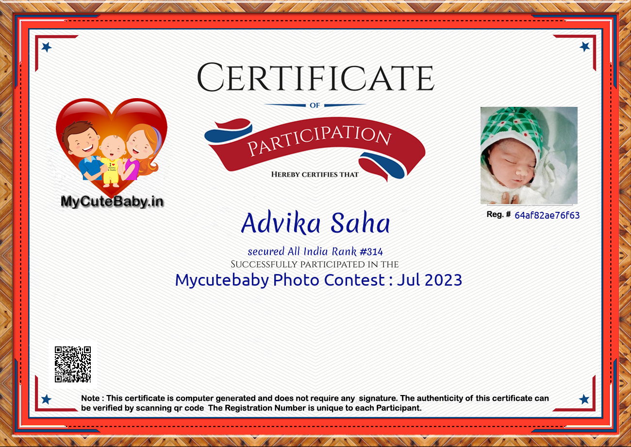 Participation certificate for all the participants whose mycutebaby votes are more than 1000.