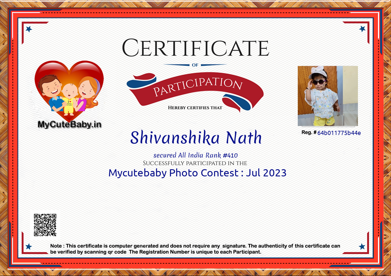 Participation certificate for all the participants whose mycutebaby votes are more than 1000.