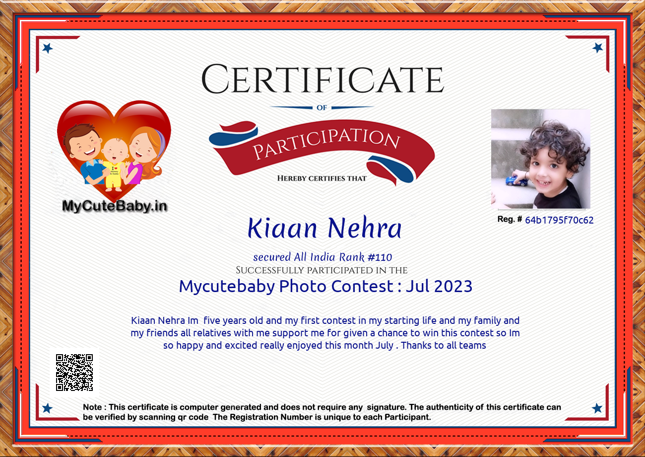 Participation certificate for all the participants whose mycutebaby votes are more than 1000.