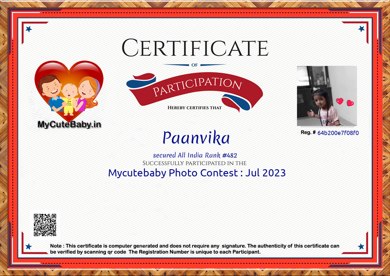 Participation certificate for all the participants whose mycutebaby votes are more than 1000.