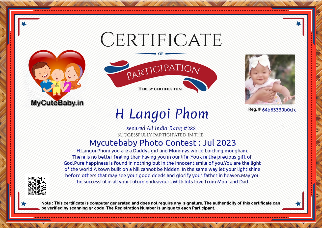 Participation certificate for all the participants whose mycutebaby votes are more than 1000.