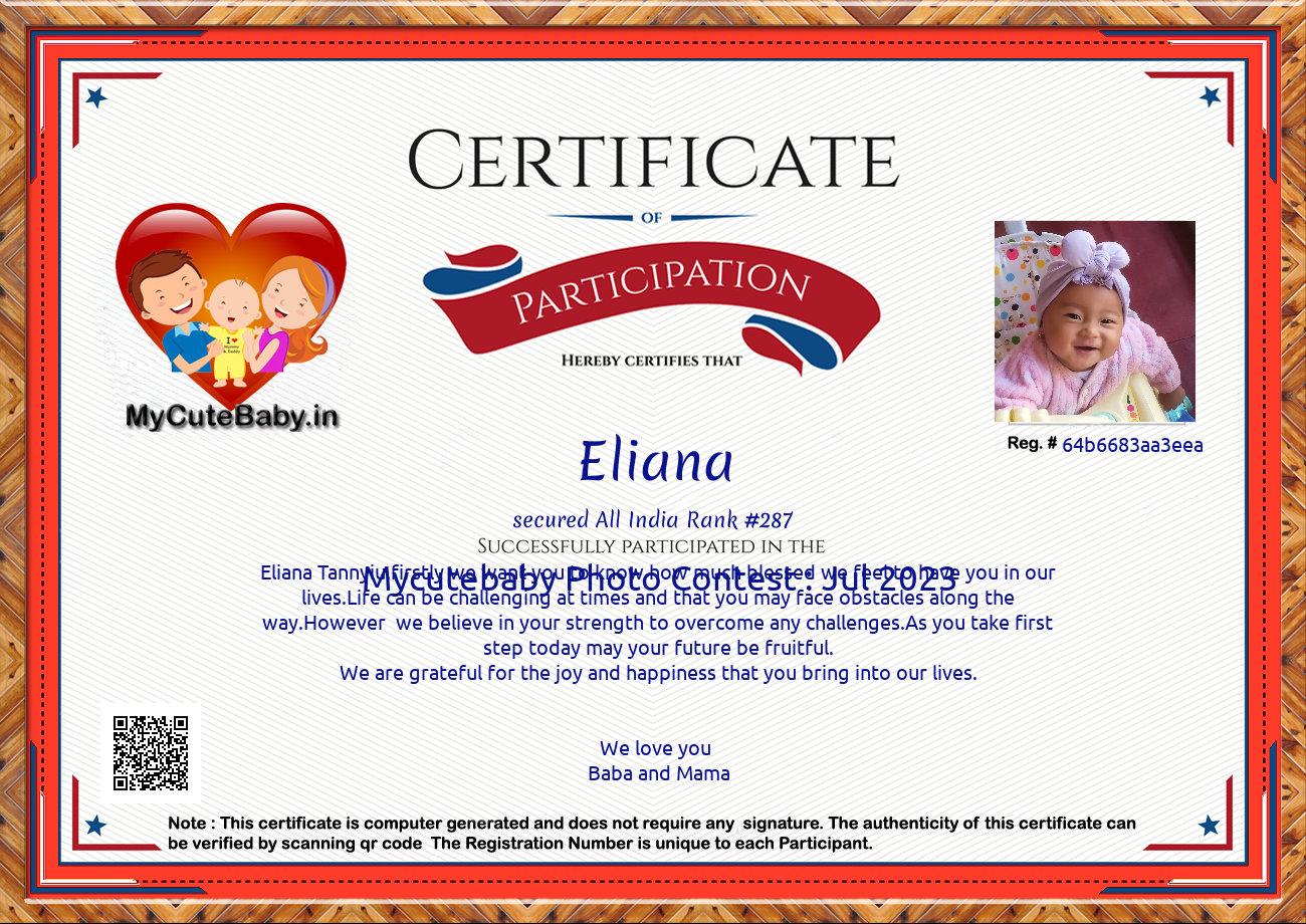 Participation certificate for all the participants whose mycutebaby votes are more than 1000.
