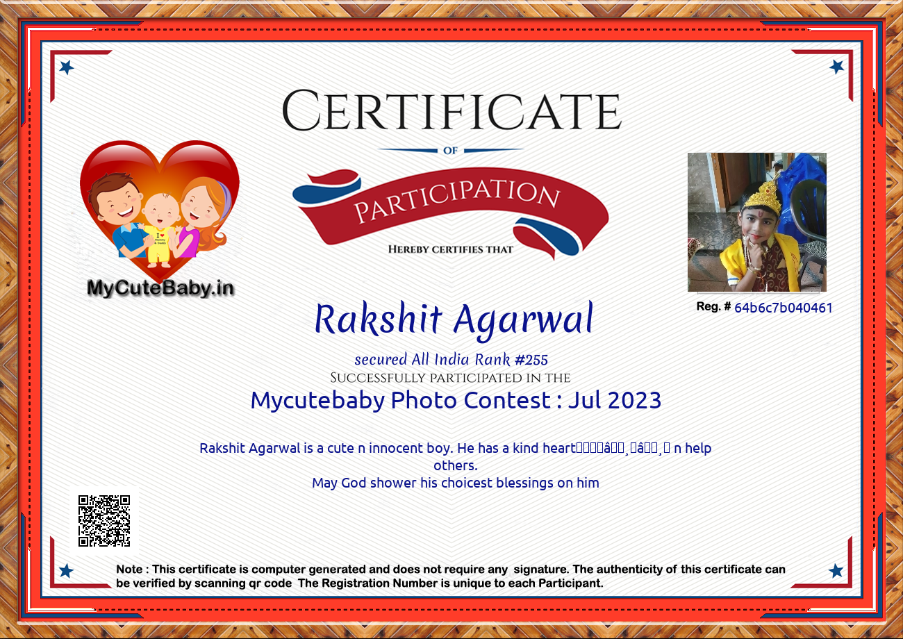 Participation certificate for all the participants whose mycutebaby votes are more than 1000.