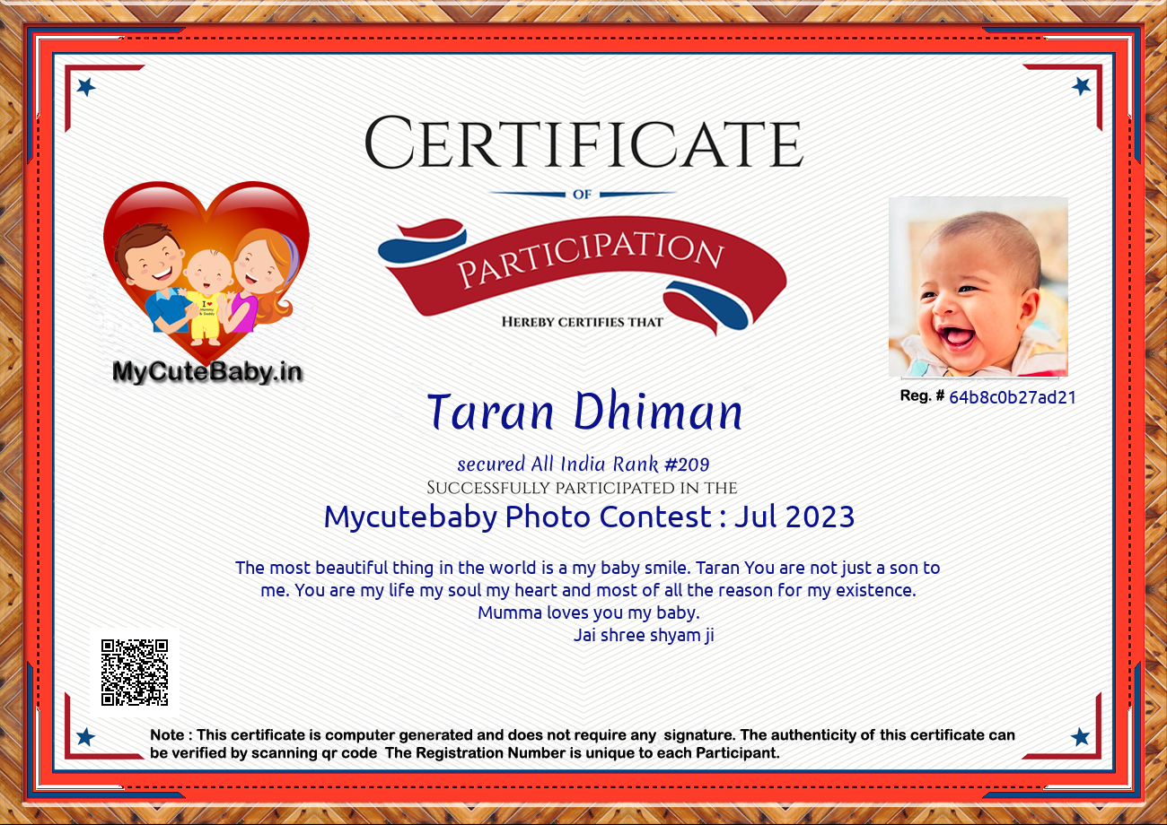 Participation certificate for all the participants whose mycutebaby votes are more than 1000.