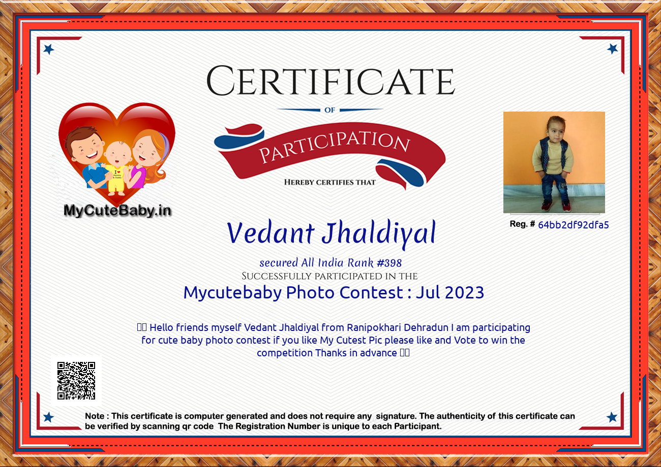 Participation certificate for all the participants whose mycutebaby votes are more than 1000.