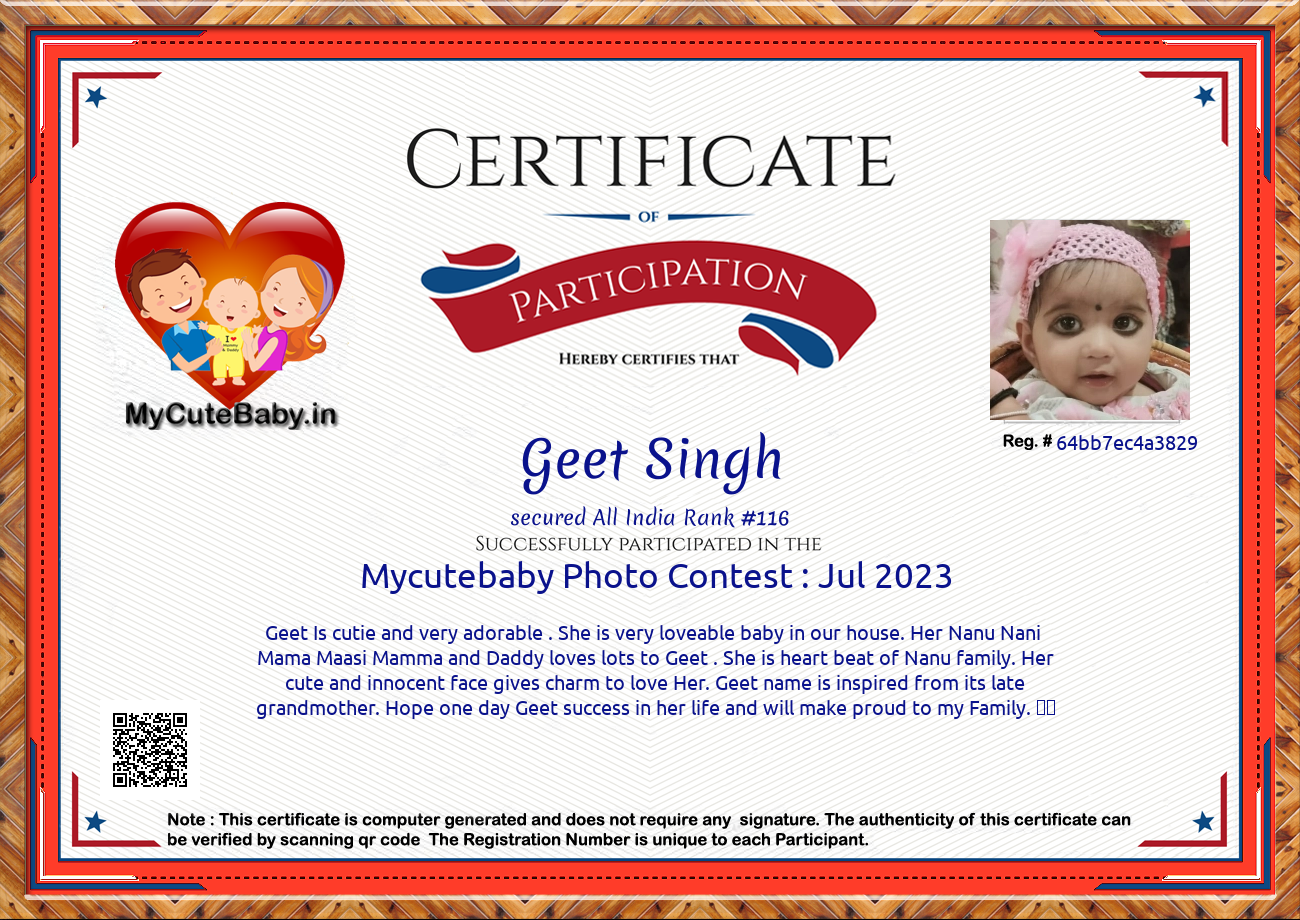 Participation certificate for all the participants whose mycutebaby votes are more than 1000.