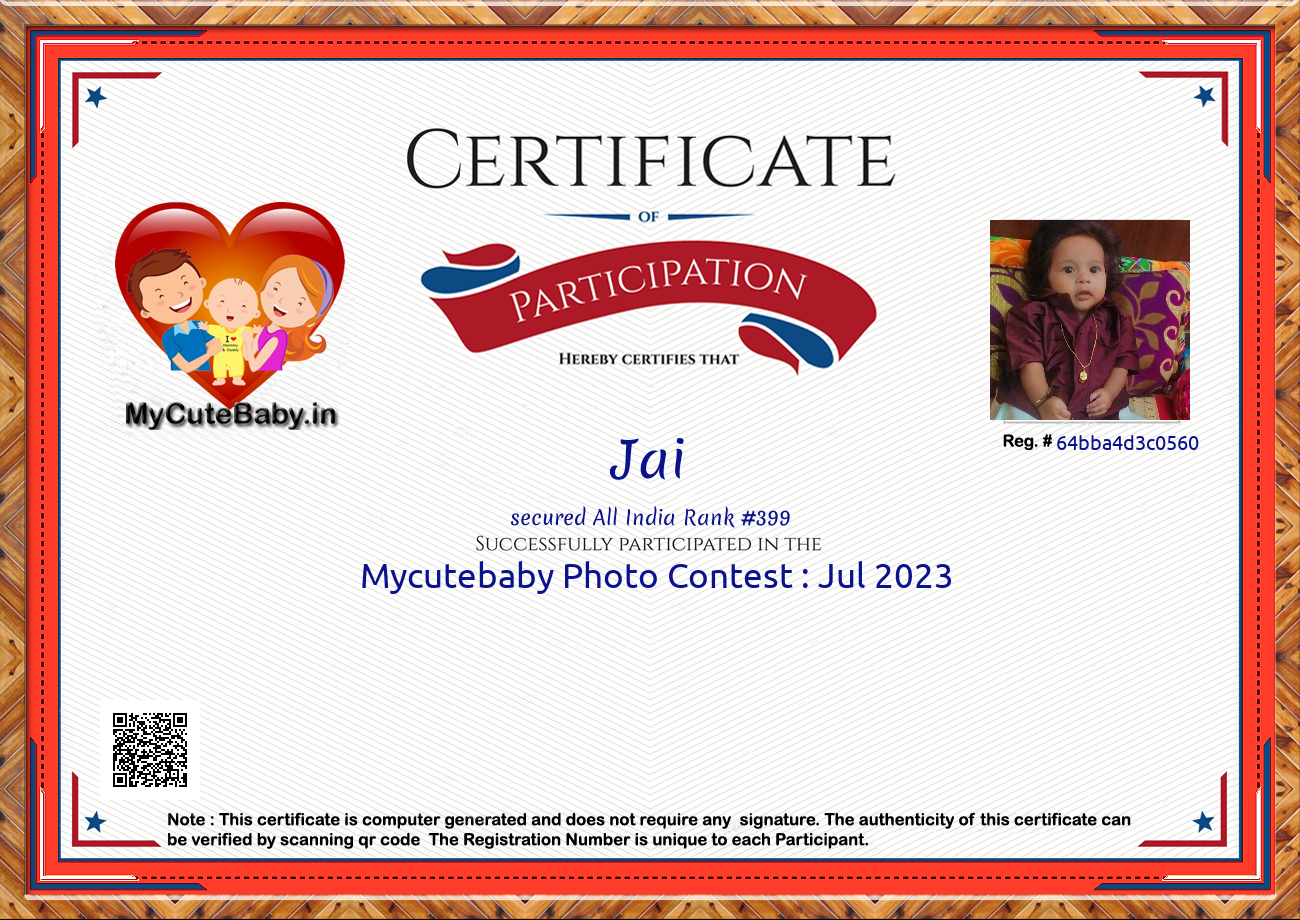 Participation certificate for all the participants whose mycutebaby votes are more than 1000.