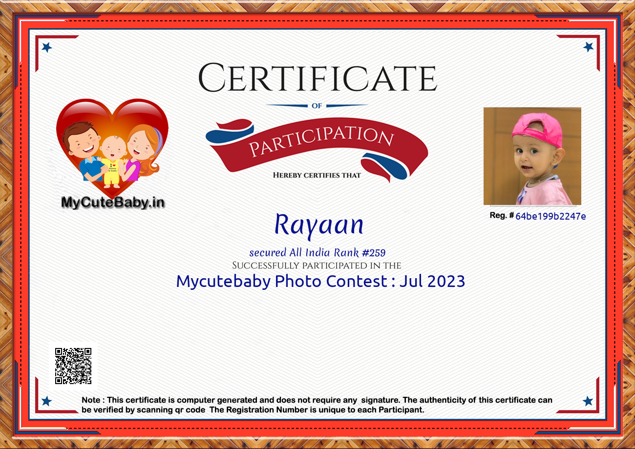 Participation certificate for all the participants whose mycutebaby votes are more than 1000.