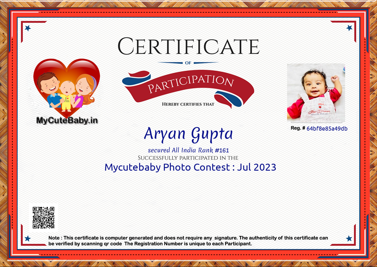 Participation certificate for all the participants whose mycutebaby votes are more than 1000.