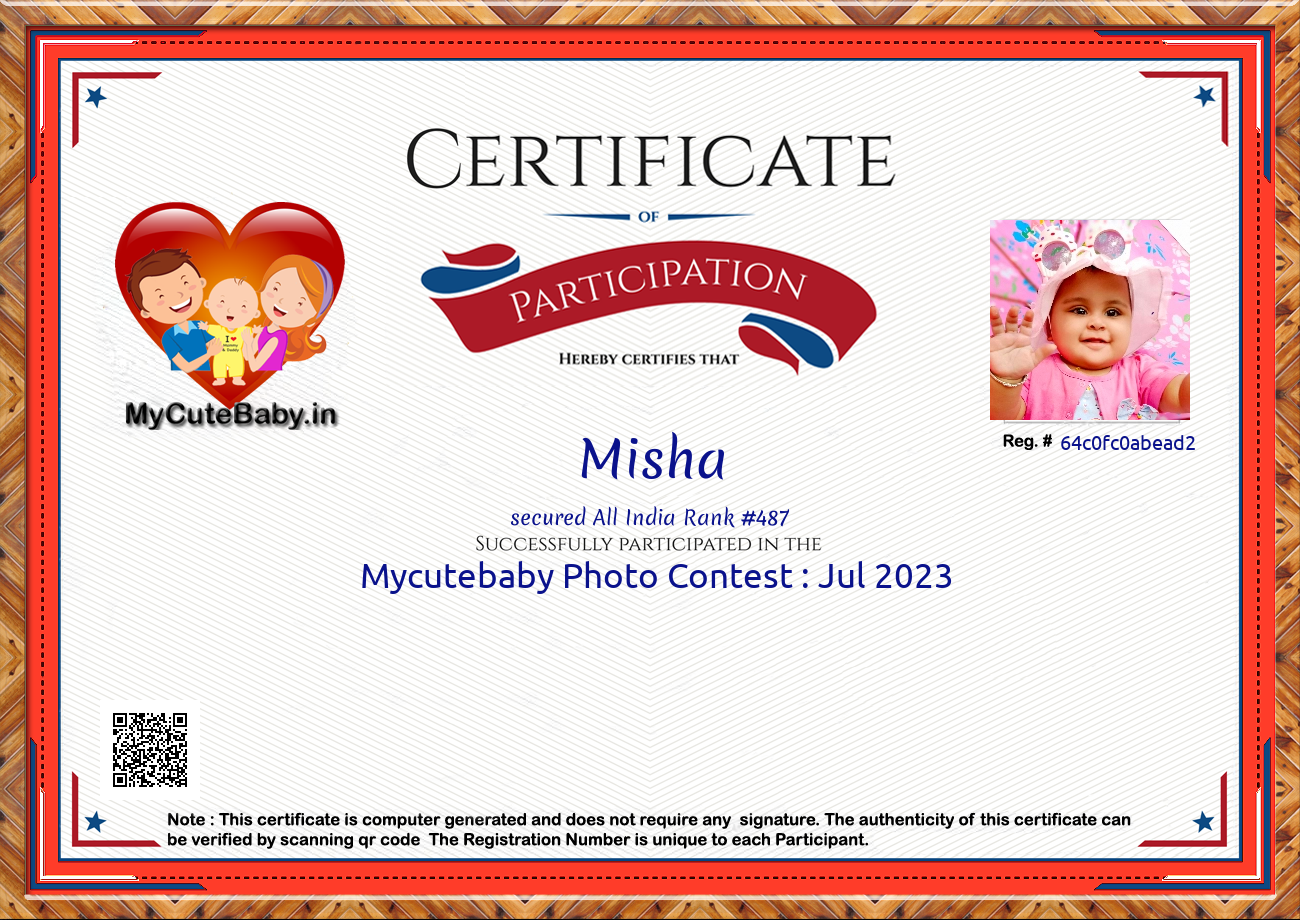 Participation certificate for all the participants whose mycutebaby votes are more than 1000.