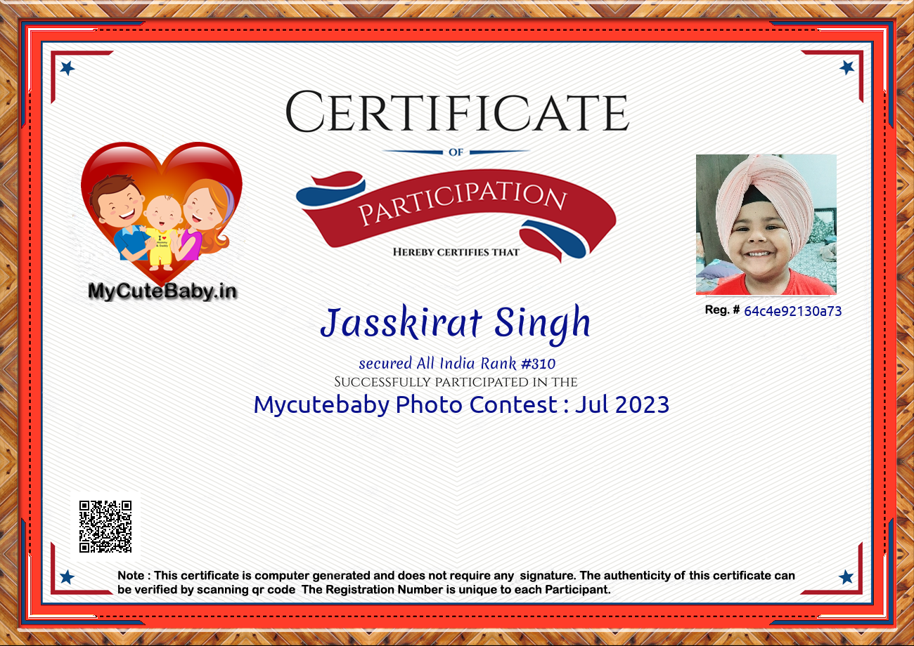 Participation certificate for all the participants whose mycutebaby votes are more than 1000.