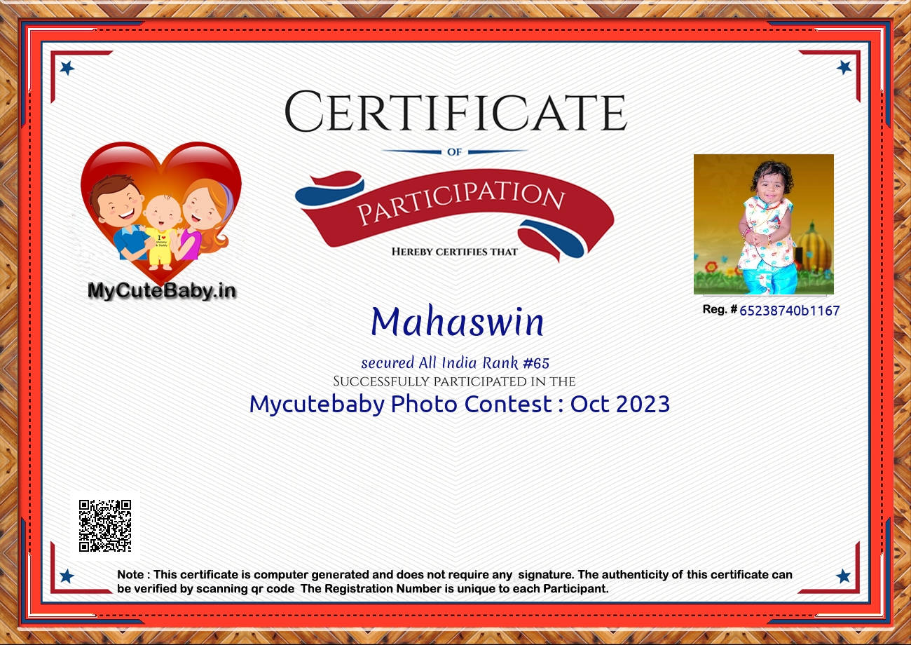 Participation certificate for all the participants whose mycutebaby votes are more than 1000.