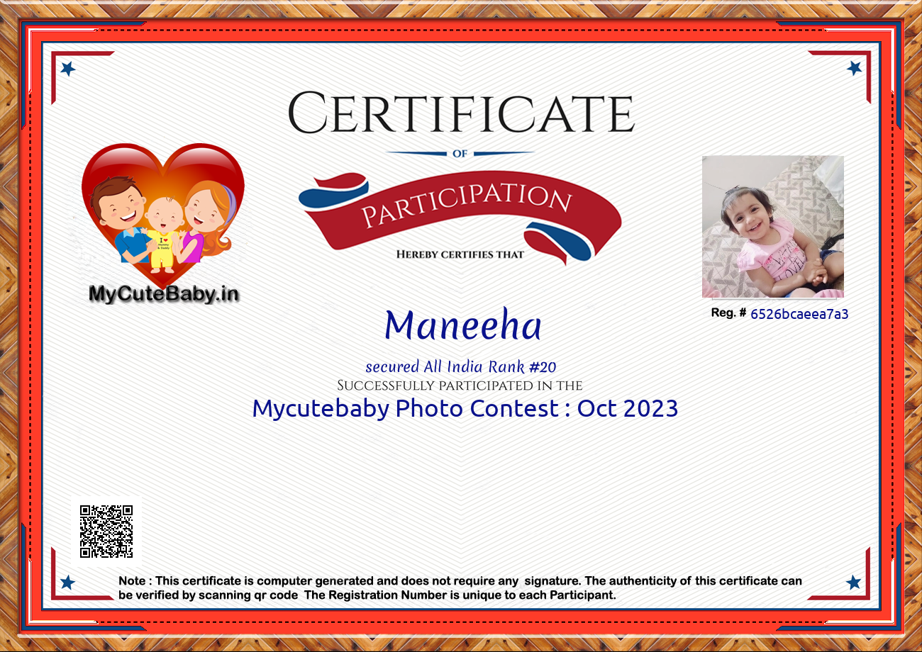 Participation certificate for all the participants whose mycutebaby votes are more than 1000.