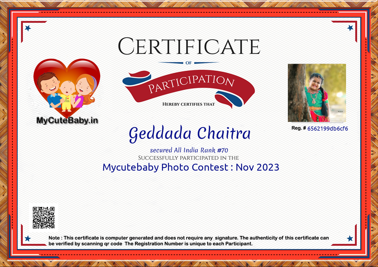 Participation certificate for all the participants whose mycutebaby votes are more than 1000.