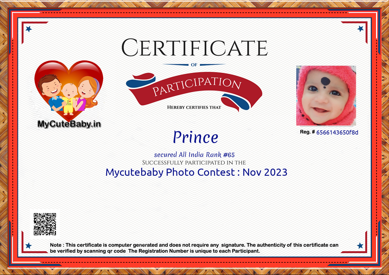 Participation certificate for all the participants whose mycutebaby votes are more than 1000.