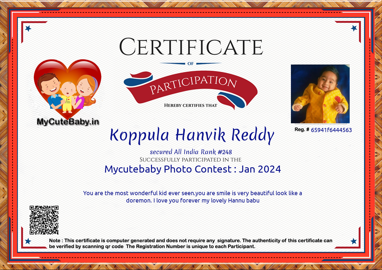 Participation certificate for all the participants whose mycutebaby votes are more than 1000.