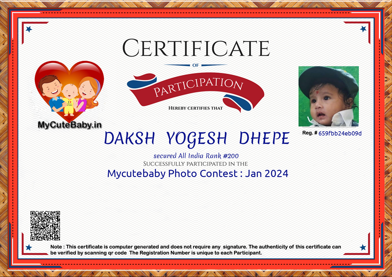 Participation certificate for all the participants whose mycutebaby votes are more than 1000.