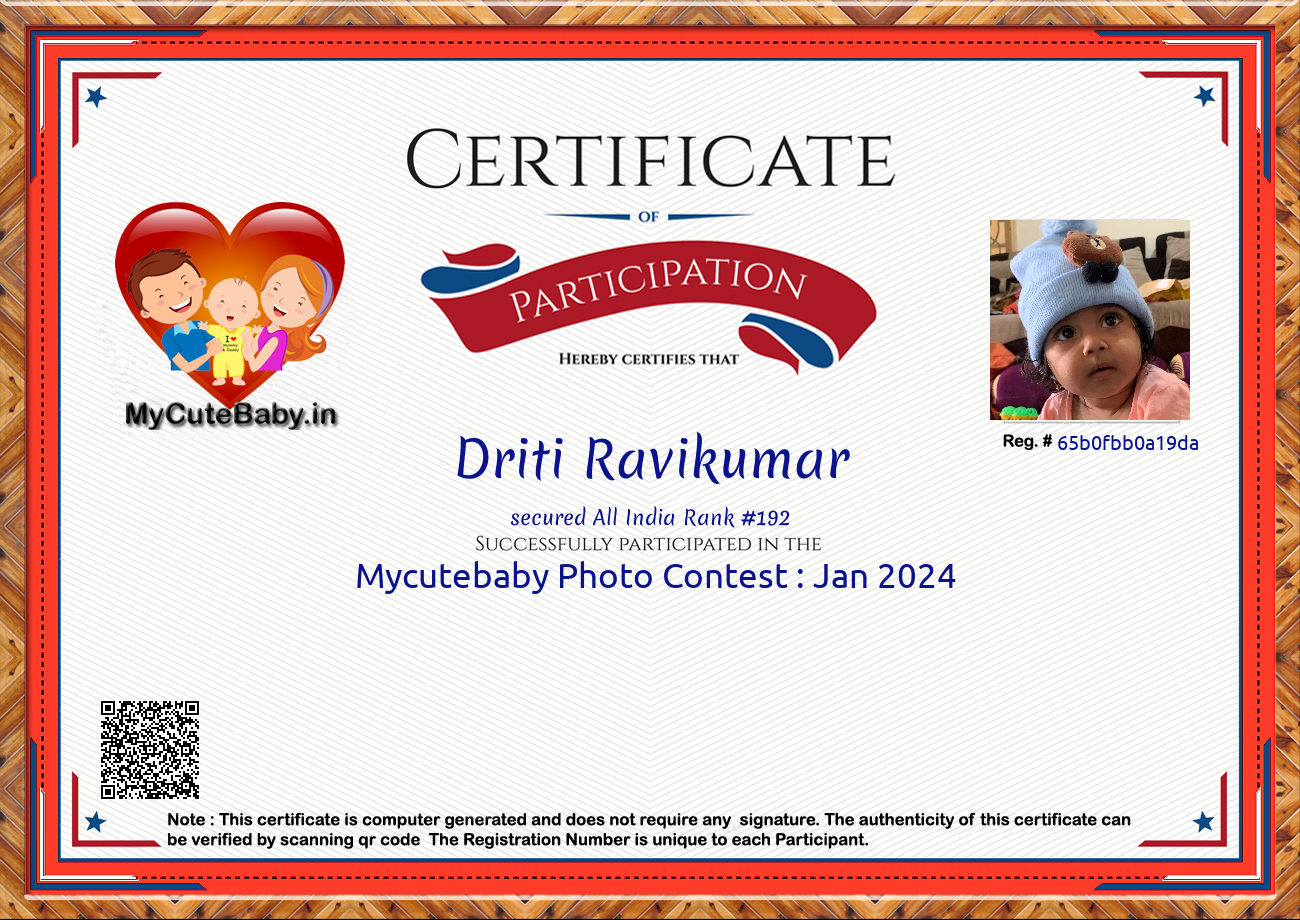 Participation certificate for all the participants whose mycutebaby votes are more than 1000.
