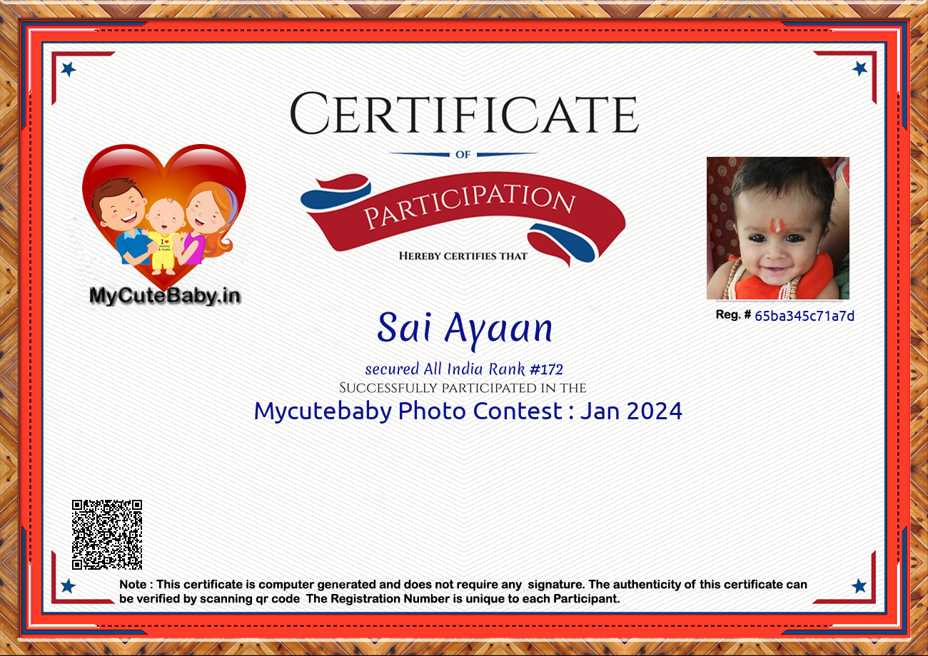 Participation certificate for all the participants whose mycutebaby votes are more than 1000.