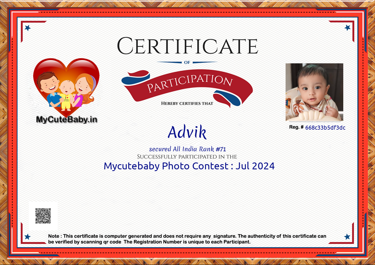 Participation certificate for all the participants whose mycutebaby votes are more than 1000.