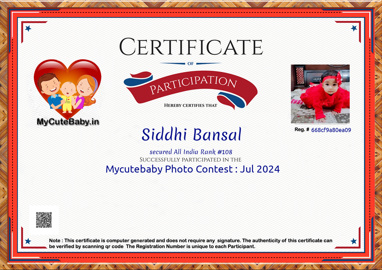 Participation certificate for all the participants whose mycutebaby votes are more than 1000.