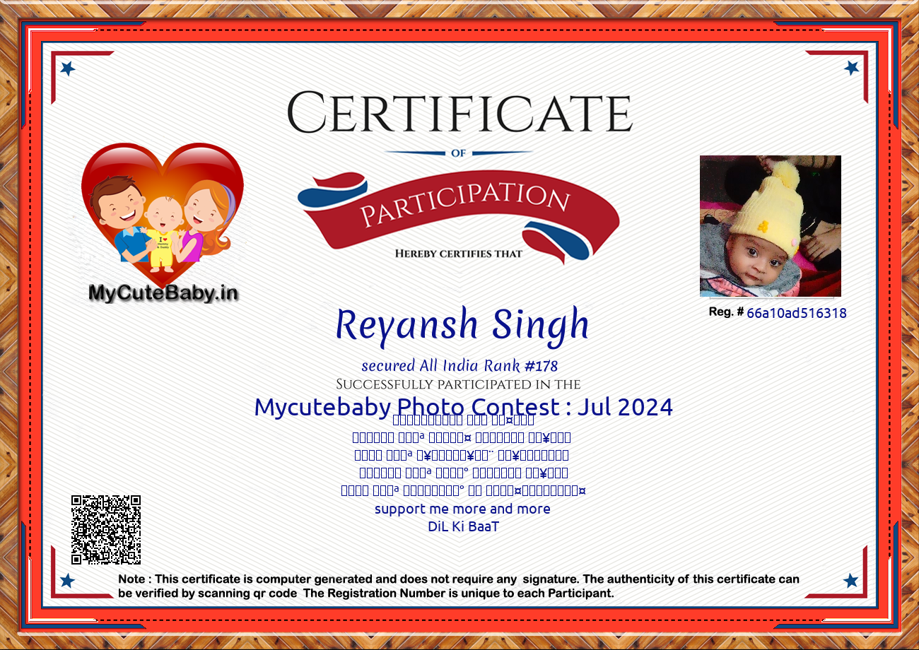 Participation certificate for all the participants whose mycutebaby votes are more than 1000.