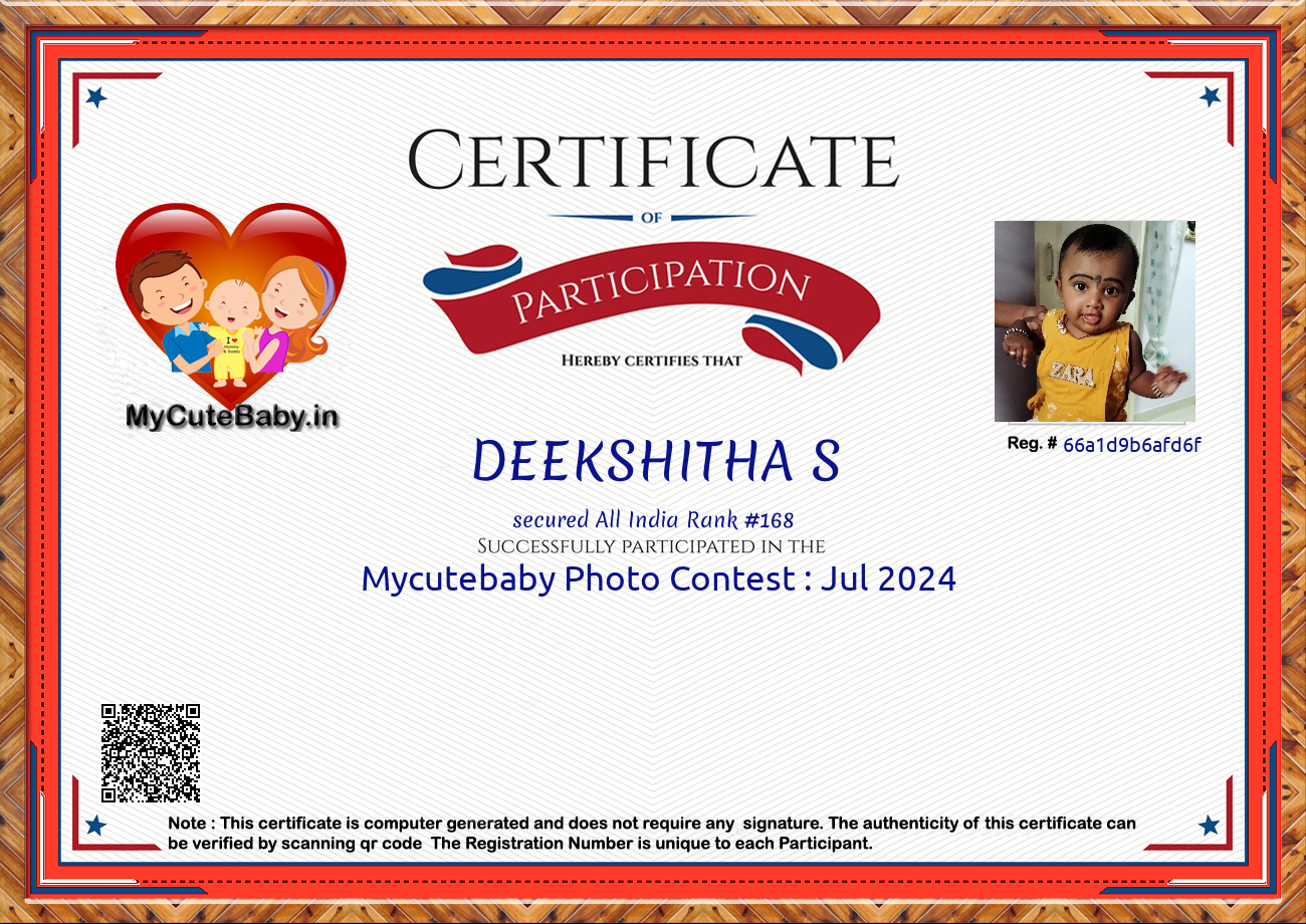 Participation certificate for all the participants whose mycutebaby votes are more than 1000.