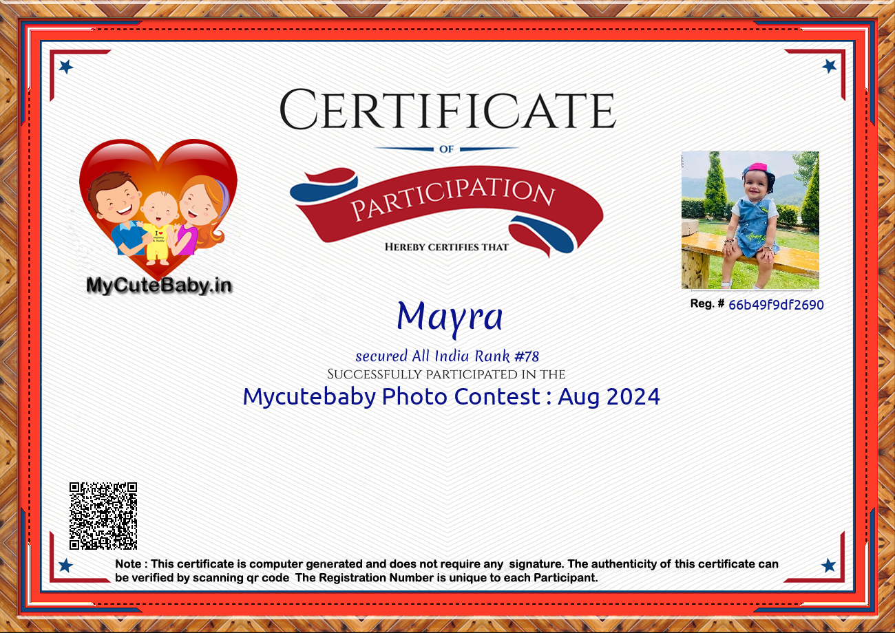 Participation certificate for all the participants whose mycutebaby votes are more than 1000.