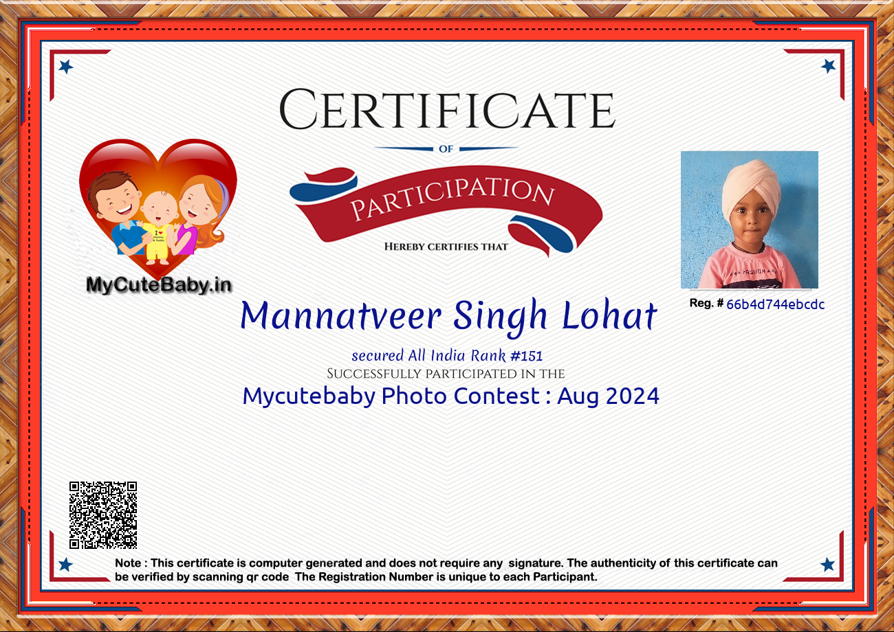 Participation certificate for all the participants whose mycutebaby votes are more than 1000.