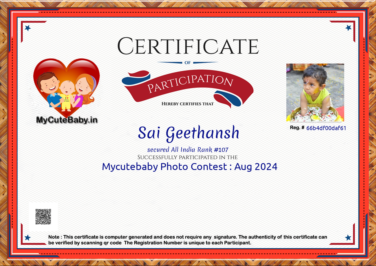MyCuteBaby is India's most trusted and oldest baby photo contest with best voting securities & transparency system. MyCuteBaby has been organizing monthly contests since February 2017 and has declared 10,400 winners across 104 monthly contests from February 2017 to September 2025 .Enter your baby's photo today for a chance to win and be featured in our gift hamper gallery for the month of November 2025! For detailed prize information, click on the 'Prizes' button to view the prize details of each and every monthly contest.