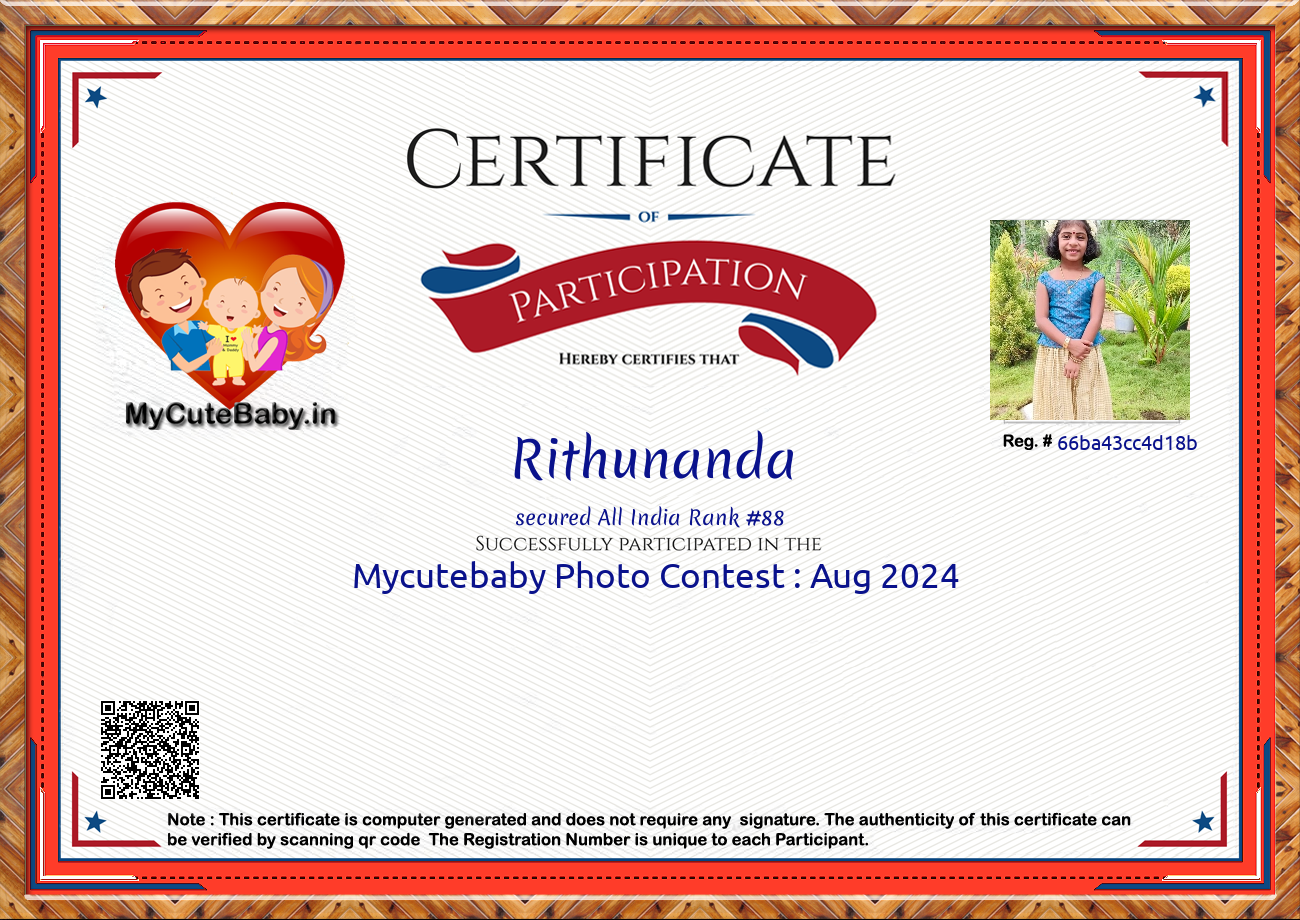 Participation certificate for all the participants whose mycutebaby votes are more than 1000.