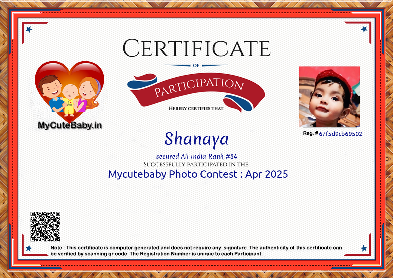 MyCuteBaby is India's most trusted and oldest baby photo contest with best voting securities & transparency system. MyCuteBaby has been organizing monthly contests since February 2017 and has declared 10,600 winners across 106 monthly contests from February 2017 to November 2025 .Enter your baby's photo today for a chance to win and be featured in our gift hamper gallery for the month of December 2025! For detailed prize information, click on the 'Prizes' button to view the prize details of each and every monthly contest.