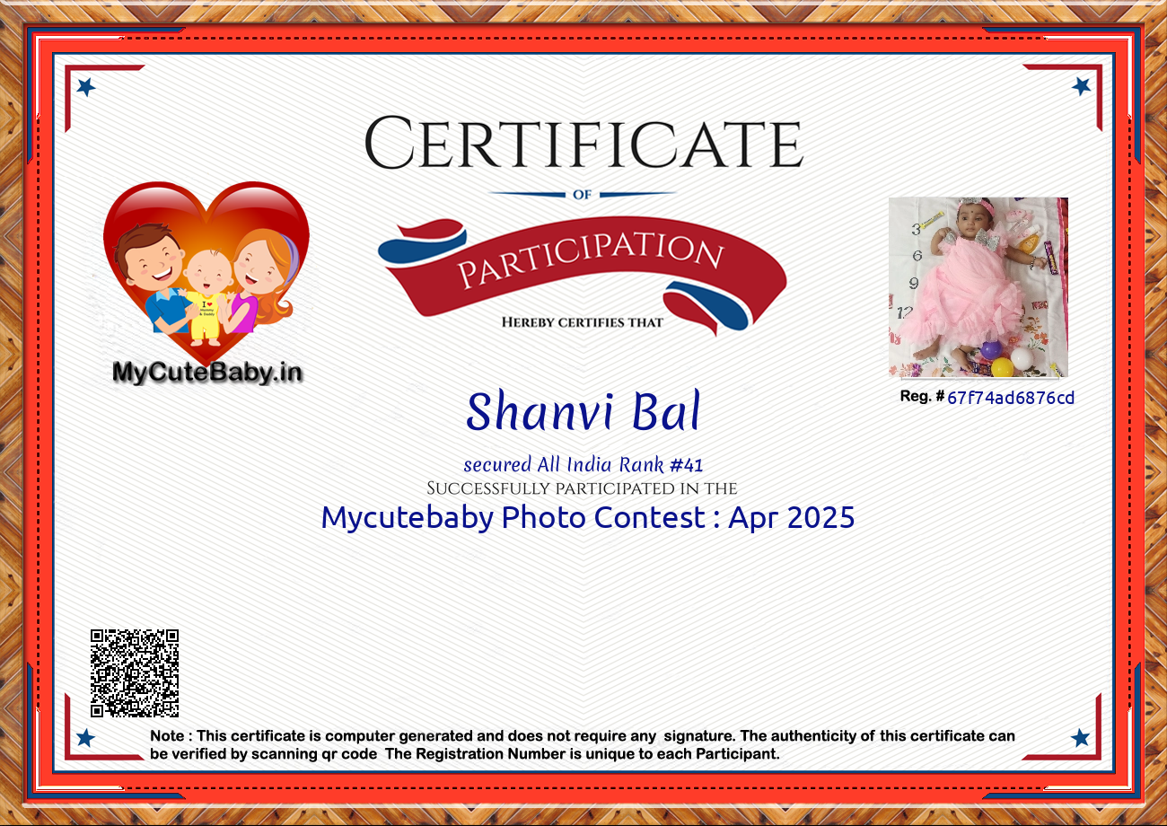 MyCuteBaby is India's most trusted and oldest baby photo contest with best voting securities & transparency system. MyCuteBaby has been organizing monthly contests since February 2017 and has declared 10,600 winners across 106 monthly contests from February 2017 to November 2025 .Enter your baby's photo today for a chance to win and be featured in our gift hamper gallery for the month of December 2025! For detailed prize information, click on the 'Prizes' button to view the prize details of each and every monthly contest.