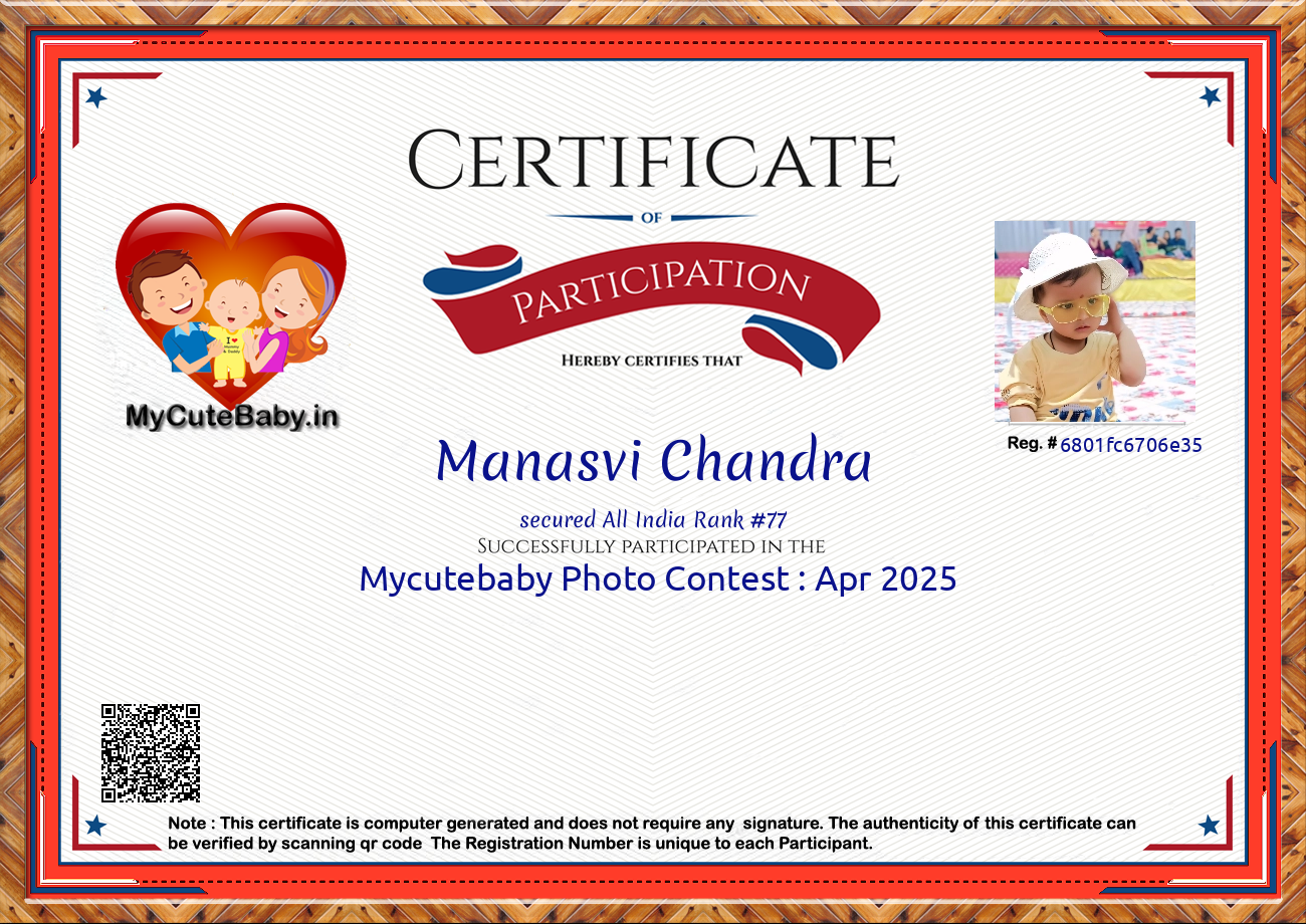 Participation certificate for all the participants whose mycutebaby votes are more than 1000.