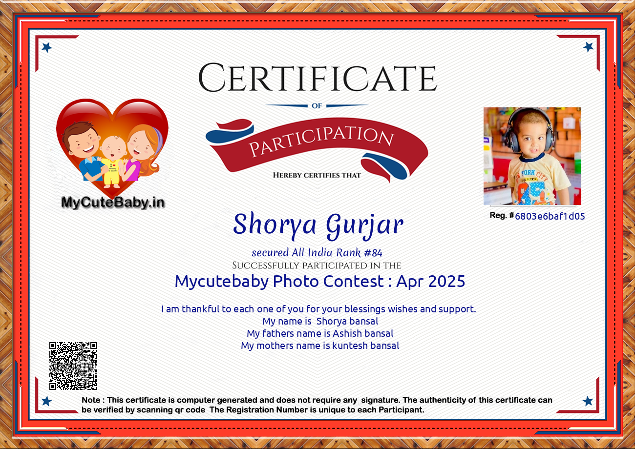 Participation certificate for all the participants whose mycutebaby votes are more than 1000.