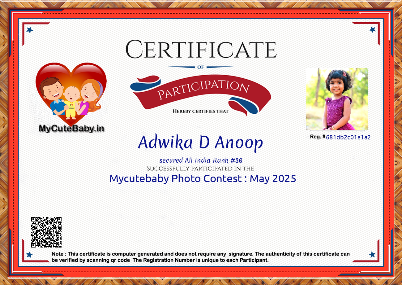 Participation certificate for all the participants whose mycutebaby votes are more than 1000.