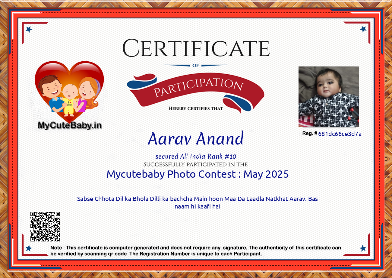 MyCuteBaby is India's most trusted and oldest baby photo contest with best voting securities & transparency system. MyCuteBaby has been organizing monthly contests since February 2017 and has declared 10,600 winners across 106 monthly contests from February 2017 to November 2025 .Enter your baby's photo today for a chance to win and be featured in our gift hamper gallery for the month of December 2025! For detailed prize information, click on the 'Prizes' button to view the prize details of each and every monthly contest.